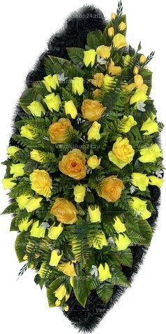 В центре композиции располагаются желтые розы с розовыми вкраплениями. Их дополняют лимонного оттенка бутоны и канареечные хризантемы. Контрастом ярким цветам выступают темная зелень елового лапника, листья папоротника и салала, а также гроздья белой акации. Венок является аллегорией непобедимого солнечного света, преодолевающего тьму.