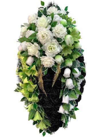 Траурная композиция из искусственных цветов. Фон выложен черными гвоздиками, олицетворяющими скорбь утраты. Верх украшают белоснежные розы, которые вносят нотку надежды и смирения. Ниспадающие гирлянды бледно-палевых лилий и алебастрового оттенка бутонов роз обрамляют венок. Ритуальную композицию дополняет зеленая листва и золотистые декоративные элементы.