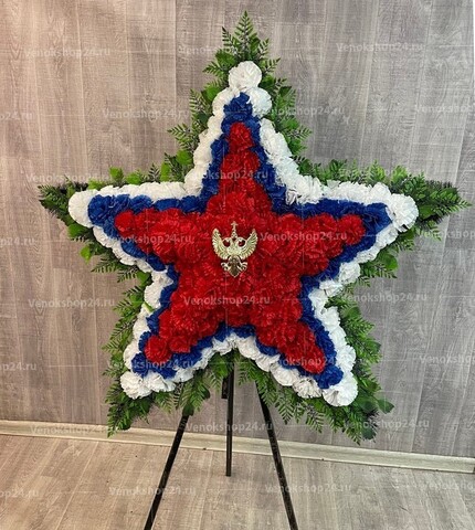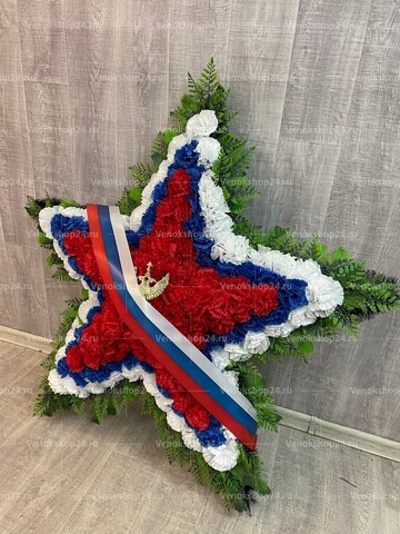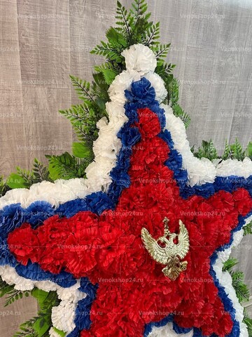 Траурная композиция в виде пятиконечной звезды символизирует честь, доблестную службу, славу. Фон венка выложен из белых, синих и красных гвоздик. Традиционно композиции в виде звезд используют в день похорон, и так же возлагаются к мемориалам, памятникам, могилам погибших военных в боевых действиях в памятные дни, как например 9 мая.