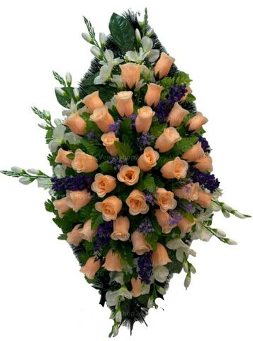 Авторская композиция состоит и крупных нежных бутонов персиковых роз и раскиданных в разные стороны веток белых эустом. Красота этого венка усиливается вкраплениями фиолетовых цветов, которые добавляют глубины и элегантности. Этот венок является символом уважения и прикосновением к сердцу. Он станет незаменимой частью вашего прощания, добавляя утешение и красоту в этот трудный момент.