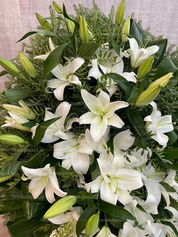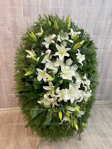 Траурный венок из живых цветов с крупными цветами белоснежной лилии. Фон выложен хвоей и пальмовыми ветвями. Композиция символизирует невинность души и Райский сад.