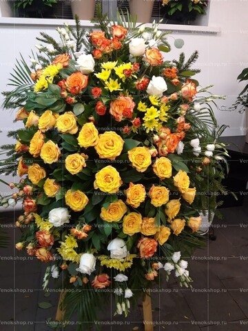 Траурная композиция в желто-оранжевой цветовой гамме. Пышные канареечные хризантемы сочетаются с миниатюрными шафрановыми розочками с огненными краями лепестков. Фоновая зелень, обрамление из пальмовых ветвей и елового лапника дополняет цветы. Венок символизирует всепобеждающий солнечный свет.