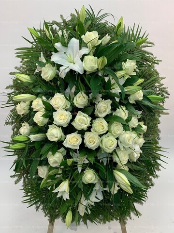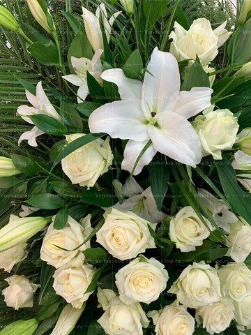 Венок похоронный выполнен в белой гамме. В центре располагаются молочные розы, а в верхней и нижней частях композиции разместились крупные белоснежные лилии. Фоновая зелень и еловые ветви подчеркивают белизну цветов. Композиция символизирует нежность чувств и невинность души.