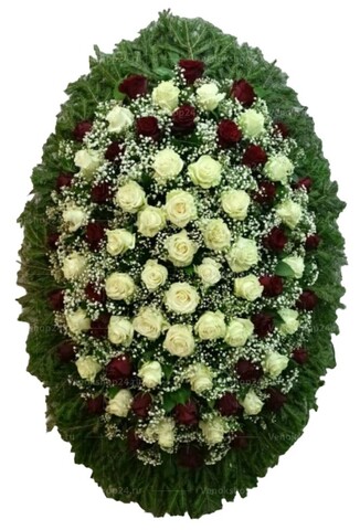 Экземпляр строгой овальной формы воспроизведён в духе сакральных учений. Основу композиции составляют две концентрические окружности из садовых роз цвета кошенили. Пространство между ними и сердечник заполнены распустившимися бутонами белоснежных роз и метёлками кипенно-белой гипсофилы. Цикличность бытия, изображённая в центральной части венка, подчёркивают тёмно-зелёные ветви аспарагуса. Растительные компоненты доставлены в свежесрезанном виде из опытных российских питомников.