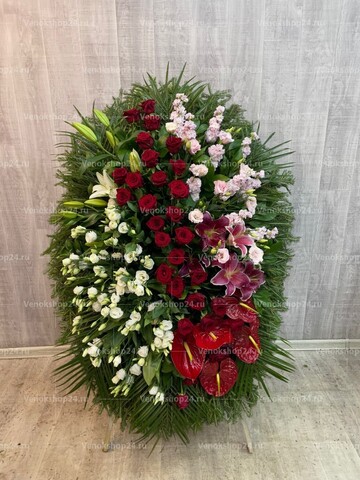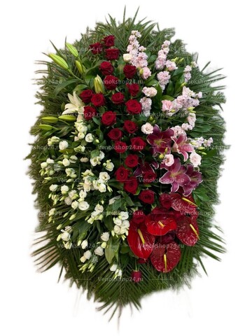 Ритуальный венок на похороны из живых цветов в розово-красно-белой гамме способен выразить нежные чувства любви и сострадания к покойному, стать символом памяти и траура. Розовые оттенки представлены нежно-розовыми эустомами и лиловыми лилиями, красные — бордово-рубиновыми розами и алыми антуриумами. Белый цвет воплощен молочного окраса эустомами и лилиями с лепестками алебастрового колера. Цветочная композиция располагается на основании, выполненном из елового лапника и пальмовых ветвей.
