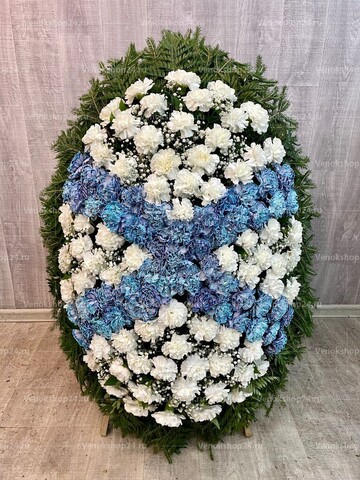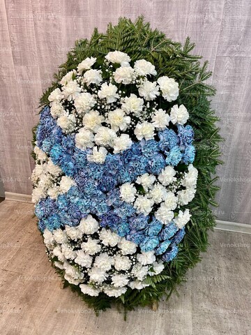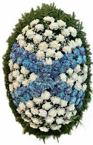 Венок составлен из живых гвоздик, гипсофилы, хвои и зелени папоротника. В центре композиции располагается образ креста Апостола Андрея. Этот косой крест светло-синего цвета на белом фоне является традиционным символом Военно-морского флота России, а ритуальная атрибутика с ним подходит для траурных мероприятий по почтению памяти павших военных ВМФ РФ.