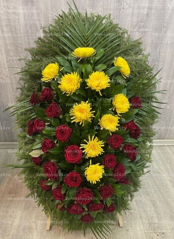 Цветовая гамма венка из живых цветов построена на сочетании желтых и багряных оттенков, что символизирует побеждающий смерть свет солнца. В центре композиции расположились ярко-желтые хризантемы, по бокам от них — бордовые бутоны роз. Натуральная хвоя обрамляет цветы.