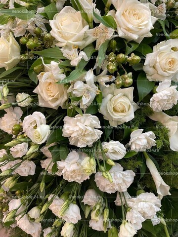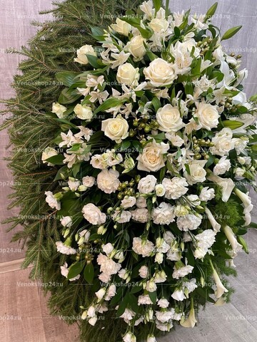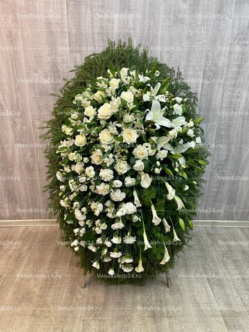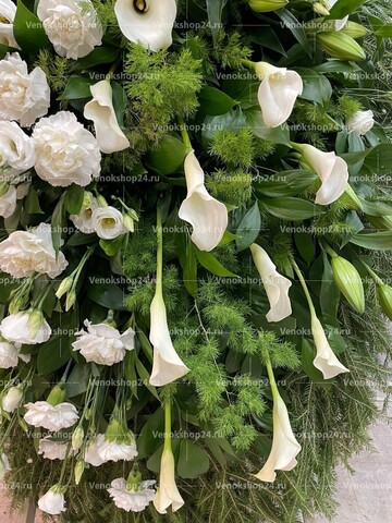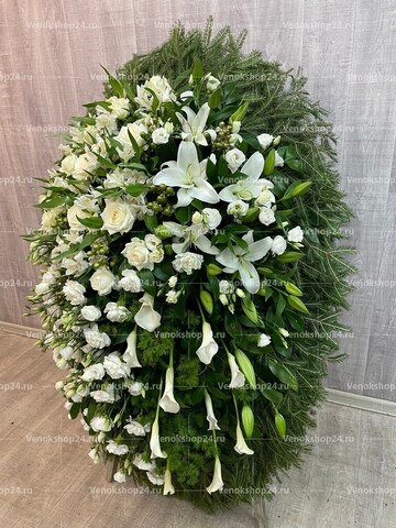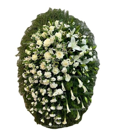Композиция траурного венка представляет собой изящное сочетание цветов в белой гамме на фоне пышной зелени листвы и хвои. Гармония светло-кремовых роз, белоснежных гвоздик, лилий с лепестками алебастрового оттенка и молочного окраса эустом олицетворяет самые светлые чувства любви и сострадания к усопшему, смирение и надежду.