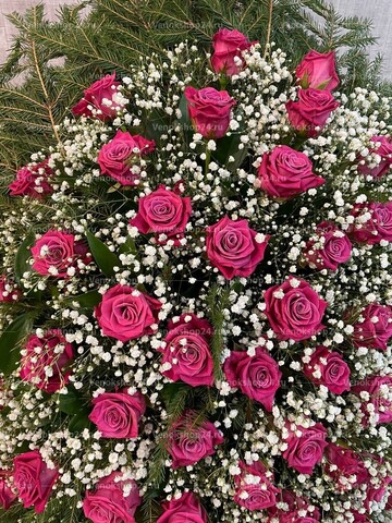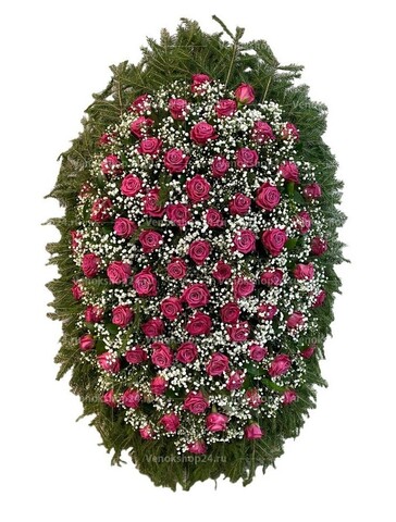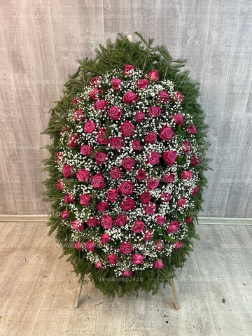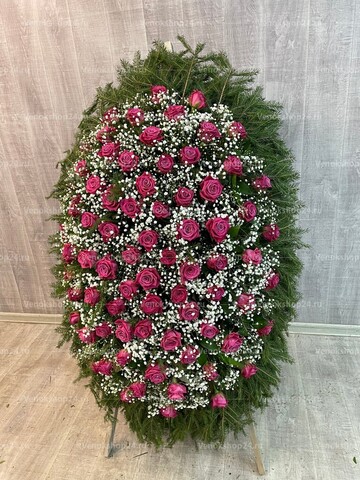Композиция ритуального венка собрана из сочетания пурпурных бутонов роз и белой гипсофилы. Вся композиция расположилась на фоне натуральной хвои. Хвоя является символом вечной жизни и надежды. Темно-розовые бутоны роз, расположенные по всему венку, добавляют нотки нежности и теплоты. Они являются символами любви и уважения к ушедшему человеку. Гипсофилы, использованные в декоре, придают венку воздушность и легкость, создавая эффект памятного облака. Венок имеет окружную форму, что символизирует бесконечность и вечность. Он идеально подходит для размещения на могиле или в помещении во время панихиды или других траурных мероприятий.