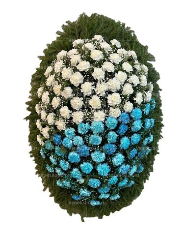Траурный венок сочетает в себе белые и голубые гвоздики, с вкраплениями белых гипсофил. Цветы расположились на фоне из вечнозелёной хвои. Верх венка украшен нежно - белыми гвоздиками, которые являются символом чистоты, уважения и благодарности. Низ венка украшен голубыми гвоздиками, которые символизируют спокойствие и умиротворение. Венок также дополнен вкраплениями гипсофил белого цвета, которые создают нежный и воздушный образ. Гипсофила является символом бессмертия и надежды на вечную жизнь, что помогает воспринимать уход усопшего как переход к новому существованию. Этот траурный венок символизирует уважение и сострадание к ушедшему, а также передаёт глубокие чувства скорби и утраты.