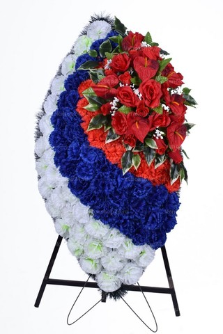 Ряды белых, синих и красных гвоздик, выложенные дугой, образуют триколор. Справа располагается композиция из багряных калл, рубиновых роз, веточек белой гипсофилы и зеленой листвы. С помощью венка на возложение 9 мая в цветах государственного флага можно достойно проводить усопшего сослуживца, видного государственного и общественного деятеля.