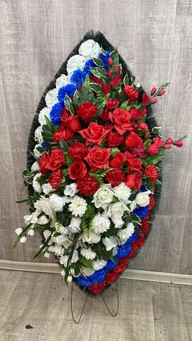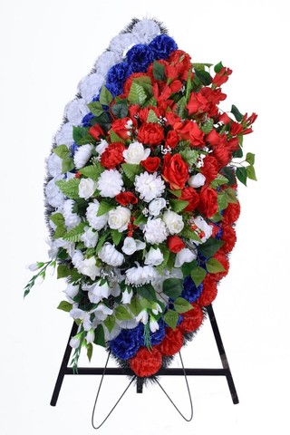 В центре венка на возложение 9 мая располагается контрастное сочетание белоснежных и алых роз, хризантем и гладиолусов, утопающих в пышной зелени. Обрамляют композицию ряды кипенно-белых, синих и красных гвоздик. Цветовая гамма венка символизирует флаг России, что делает его подходящим для общегосударственных дней траура и скорби, для возложения к мемориалам и памятникам.
