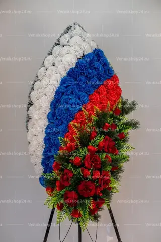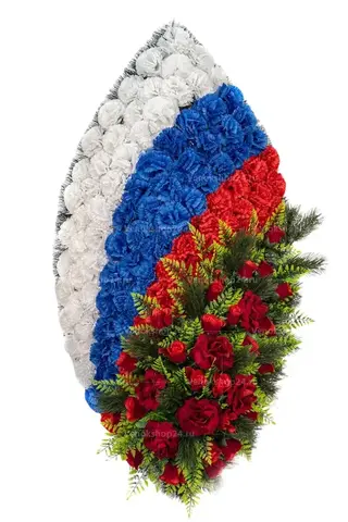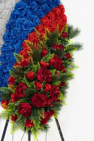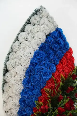 Траурный венок на возложение в цветовой гамме российского флага подходит для официальных мемориальных мероприятий, как военных, так и гражданских.