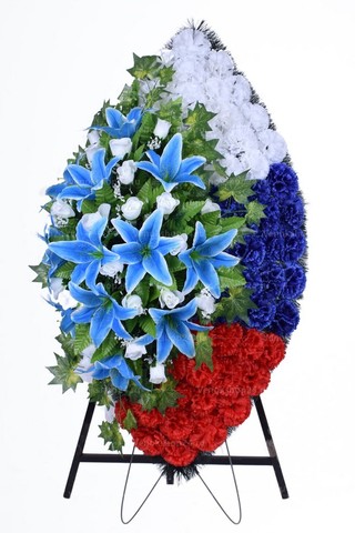 В левой части располагается цветочная композиция из крупных голубых лилий, белоснежных бутонов роз и зеленой листвы папоротника и плюща. Фон выложен белыми, синими и красными гвоздиками. Траурный венок на возложение к могиле подойдёт для почтения памяти ушедших военных и госслужащих.