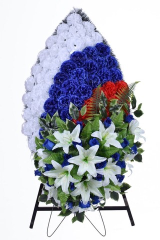 В нижней части композиции крупные белые лилии являются акцентом. Их оттеняют бутоны роз в оттенке индиго и листья папоротника и салала. Фон выложен белоснежными, синими и красными гвоздиками. Венок на 9 мая с государственной символикой подойдёт для траурных мероприятий по случаю общероссийского траура.