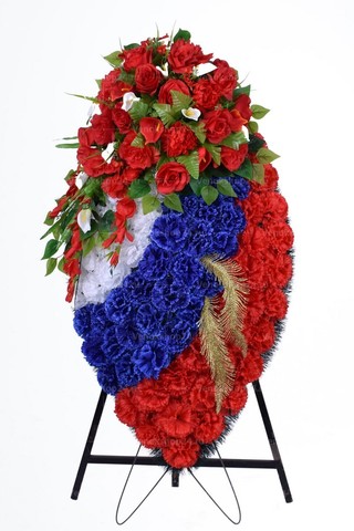 Верх венка триколор увенчан цветочной композицией из карминовых роз, огненно-красных хризантем, молочных калл и алых гладиолусов. Фон выполнен в цветах российского флага из белоснежных, синих и красных гвоздик. Композиция декорирована золотистыми веточками и флористической зеленью. Этот траурный атрибут станет достойным жестом прощения с военным или госслужащим.