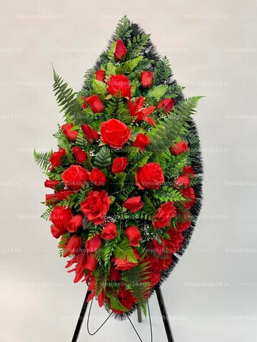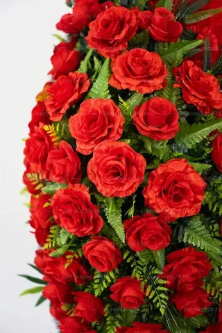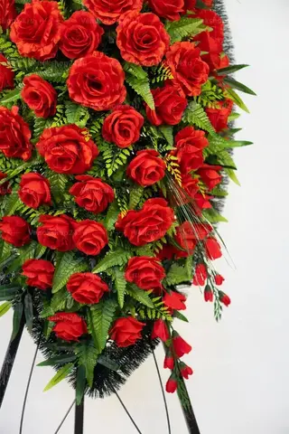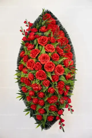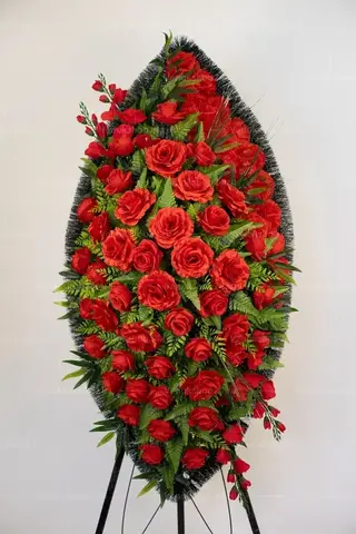 Ритуальный венок представляет собой россыпь алых роз, утопающих в обильной зелени. Изделие дополняют красные лилии и гвоздики того же оттенка. Эта классическая композиция выразит любовь и уважение к усопшему.