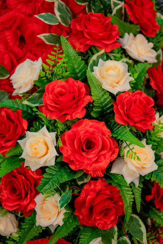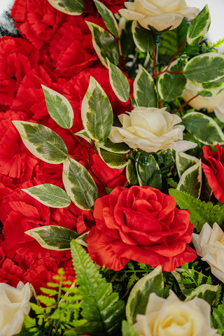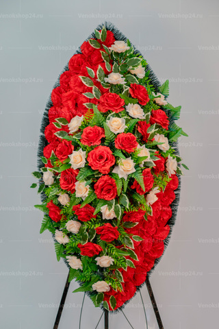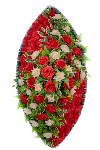 В центре - композиция из алых и нежно-персиковых роз, фоном выложены красные гвоздики. Этот изысканный венок на похороны способен выразить любовь к усопшему и невосполнимую утрату скорбящего.