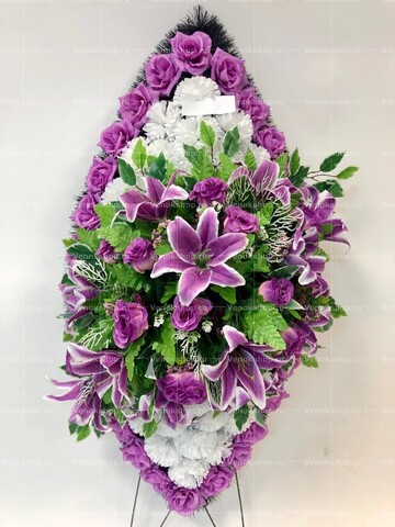 В центре венка из искусственных цветов композиция из сиреневых лилий и роз в комбинации с серебристой зеленью цинерарий. Фоном выложены белые гвоздики. Изделие обрамлено рядом сиреневых гвоздик и гирляндой из хвои. Символизирует чистоту, нежность.