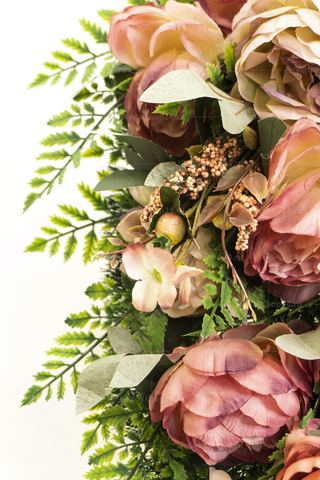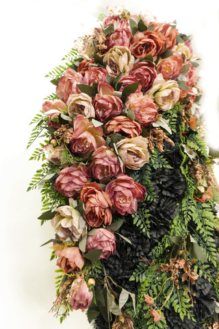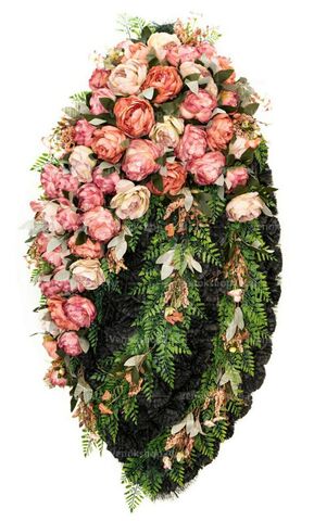 На черном фоне из гвоздик расположилась композиция из прекрасных розово-кремовых бутонов пионов, роз и зелени. Эти крупные, яркие и нежные цветы добавляют нотки надежды и тепла в траурную обстановку, создавая баланс между горем и любовью к ушедшему. Этот траурный авторский венок позволяет выразить глубокие чувства утраты и скорби. И так же послужит выражением уважения и почтения к ушедшему. Станет символом поддержки и утешения для его близких и родных.