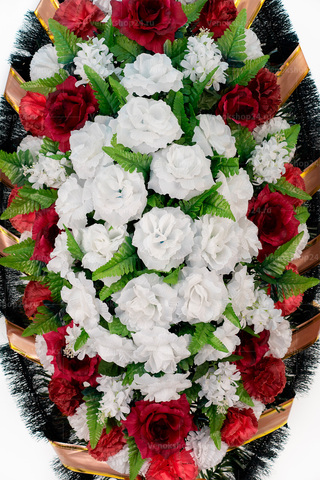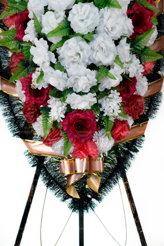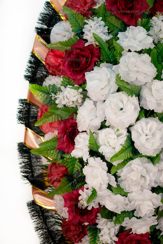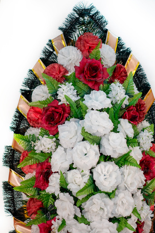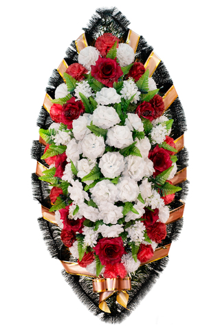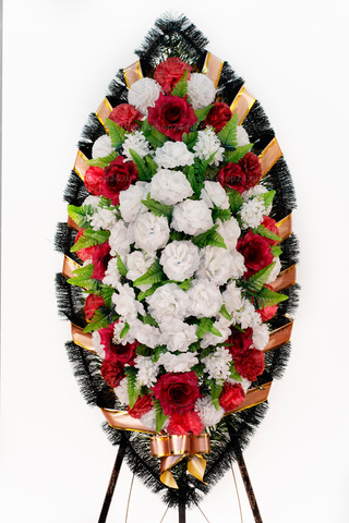 В центре композиции белые розы в окружении темно-красных гвоздик, роз и листьев. Цветы обрамляет гирлянда из хвои, обвитая золотой лентой. Венок из искусственных цветов выразит чувства глубокой скорби и невосполнимой утраты.