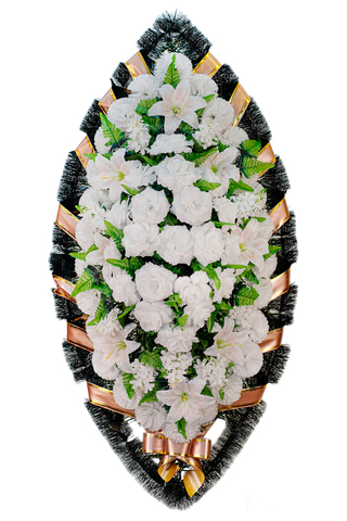 Центр композиции выложен белыми розами на фоне сочной зелени. По периметру размещены белоснежные лилии и гвоздики. Композицию обрамляет хвоя, декорированная золотой лентой. Ритуальный венок символизирует духовную чистоту и надежду.