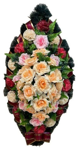 Композицию из персиковых и розовых роз дополняет ряд алых гвоздик и декоративная зелень. Обрамлением служит еловая гирлянда, обвитая лентой с золотой каймой. Цветы этого похоронного венка символизируют скромность и чистоту души.
