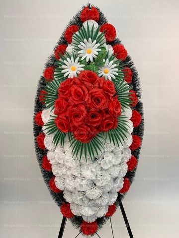 В составе венка красные розы, пальмовые ветви и ромашки на фоне белоснежных гвоздик. Красные гвоздики и хвоя обрамляют композицию. Три цветка ромашки олицетворяют Троицу и символизируют возвращение к новой жизни. Красная роза является символом Богородицы.