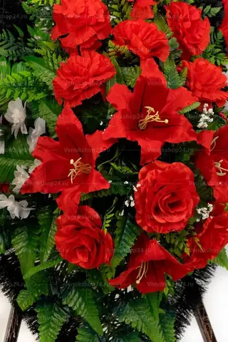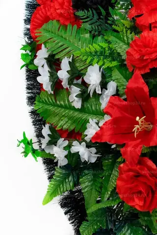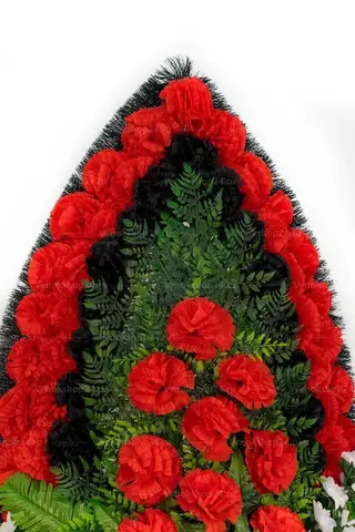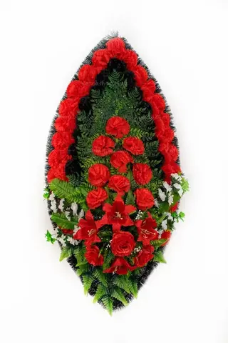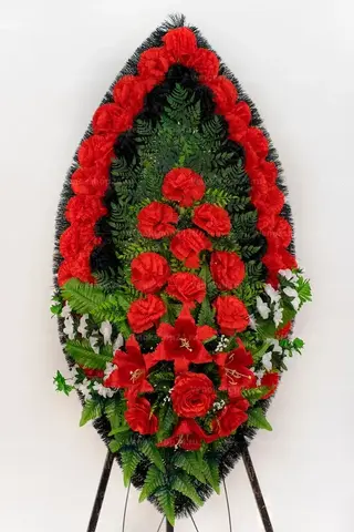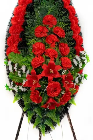 Траурный венок на похороны классической овальной формы из искусственных цветов. В композиции доминируют красные гвоздики — традиционные цветы памяти и скорби. Их цветовую гамму поддерживают гранатового окраса лилии и алые розы, олицетворяющие сострадание и любовь к покойному. Черные гвоздики усиливают траурное настроение, а белые миниатюрные хризантемы вносят нотку надежды.