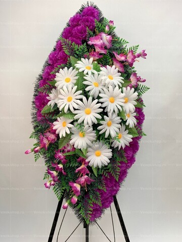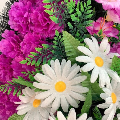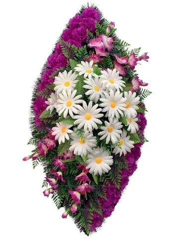 В центре траурной композиции из искусственных цветов расположились ромашки. Эти трепетные цветы олицетворяют невинность души и надежду. Дополнением служат элегантные соцветия гладиолусов с лепестками цвета фуксия и фон из изящных лиловых гвоздик, а также листва зелени.