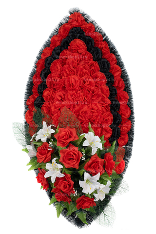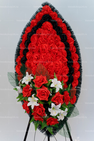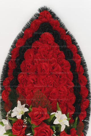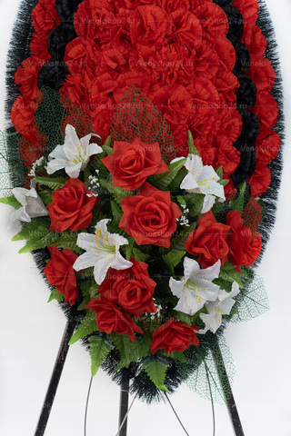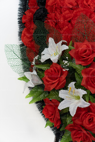 Основа венка выложена ярко-красными и черными гвоздиками. Эти цветы традиционно символизируют скорбь и память об усопших. Низ венка украшает сочетание алых роз и белоснежных лилий, олицетворяющих подлинную любовь, сострадание и чистоту.