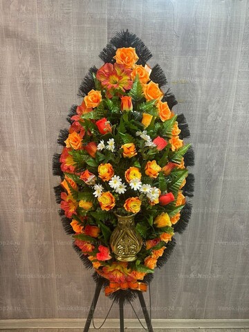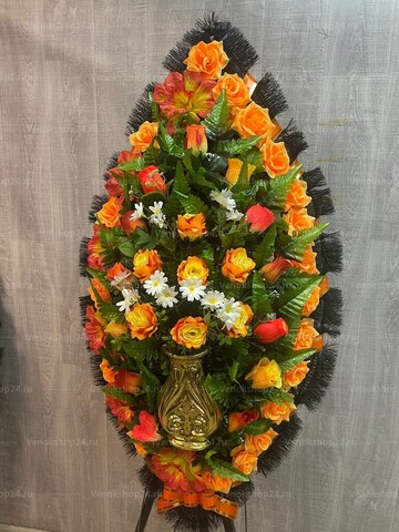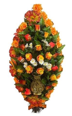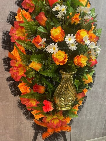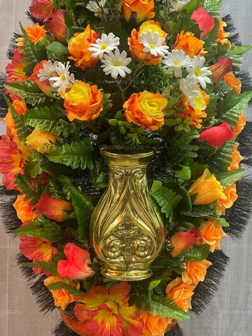 Траурный венок из искусственных цветов создает уникальную атмосферу скорби и воспоминаний. Он воплощает в себе нежность и красоту, символизируя память о ушедшем. Венок состоит из жёлто-оранжевых роз и лилий, которые своей яркостью и изяществом выражают уважение и почтение к ушедшему. Вкрапления белых ромашек придают композиции нежность и чистоту, символизируя надежду и покой. Пластиковая ваза в центре композиции обрамляет венок и создает еще большую гармонию и эстетическое впечатление. Этот траурный венок из искусственных цветов является уникальным выражением уважения и любви к памяти ушедшего.