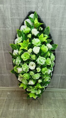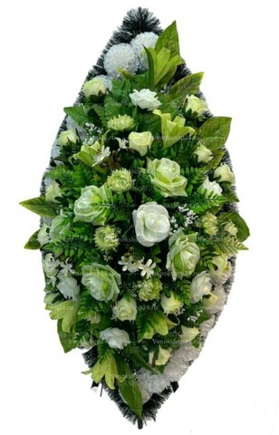 На фоне из белых гвоздик собраны светло-зеленые розы и лилии, а также белые бутоны роз и зелень. Один из символов траура, белые гвоздики, насыщены символикой безусловной и чистой любви. Эти нежные цветы добавляют нотку света и спокойствия в этот траурный венок, призванный утешить сердца родных и близких покойного. Светло-зеленые розы вносят в венок особый оттенок надежды и обновления, символизируя то, что и любовь живет вечно. Лилии, помогают выразить горечь и утрату. Белые бутоны роз всегда ассоциировались с чистотой и вечностью. Этот венок станет достойным и трогательным проявлением вашей скорби. Он подарит утешение и поддержку родным и близким, позволяя им отдать дань уважения и помочь им преодолеть боль потери.