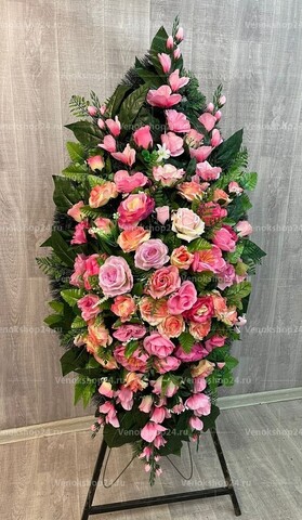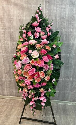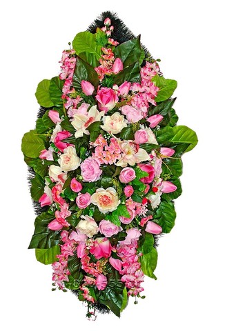 Венок из искусственных цветов в нежной розовой гамме. Розы и дельфиниумы этого оттенка соседствуют с лилиями и розами персикового цвета. Фоном служит сочная зелень салала. Изящная композиция символизирует вечную память и любовь в сердце скорбящего.