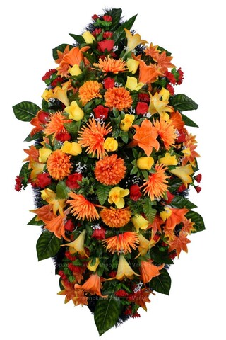 Яркая цветочная композиция представлена морковными, шафрановыми и багряными хризантемами, оранжевыми и желтыми лилиями, а также канареечными и алыми бутонами роз. Пестроту цветов оттеняет темно-зеленая листва и веточки белой гипсофилы. Этот венок огненных оттенков выразит самые теплые чувства к усопшему.