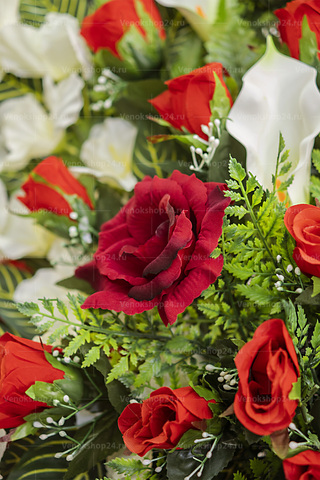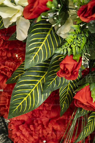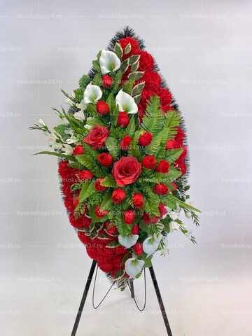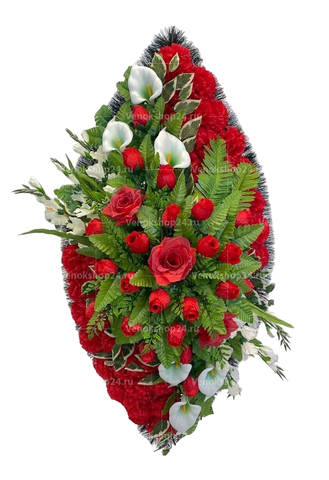Ритуальная флористическая композиция из искусственных цветов в красно-белой гамме. Центральная часть траурного венка представляет собой композицию из алых роз и карминно-красных бутонов на фоне пышной зелени папоротника. Красный тон поддерживают гвоздики с лепестками в оттенке киноварь, выложенные фоном. Белый цвет представлен вкраплениями молочных соцветий дельфиниумов и кипенно-белых цветов калл.