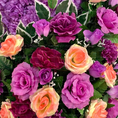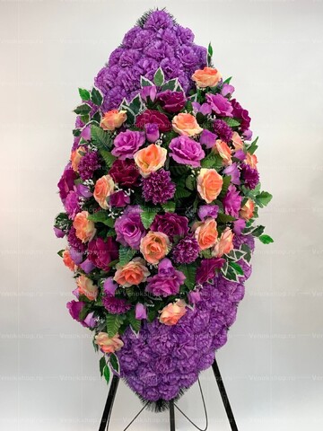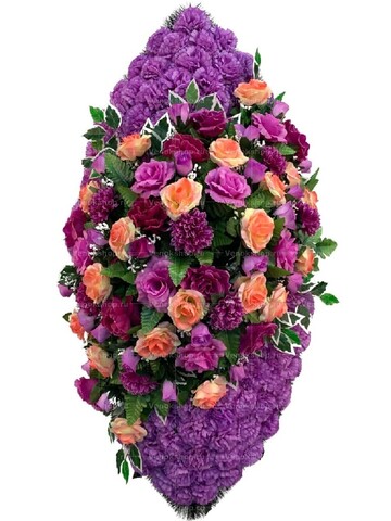 Ритуальный венок из искусственных цветов в лиловой гамме. Центр выложен сочетанием фиолетовых, персиковых и сиреневых роз, пурпурных пышных хризантем и изумрудной зелени. Фон составлен из гвоздик лавандово-розового окраса. Необычный дизайн траурной композиции способен подчеркнуть оригинальность личности усопшего и отдать дань уважения его памяти.