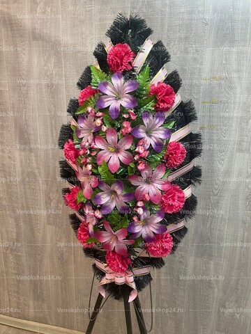 Эта траурная композиция - нежное и трогательное произведение искусства. Она украшена ярко-розовыми гвоздиками, которые символизируют уважение и преданность, а также розовыми и фиолетовыми лилиями, которые придают ему изысканность и тонкость.