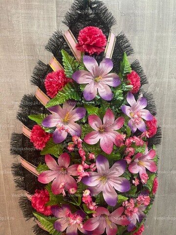 Розовые и фиолетовые лилии, с их изящными и грациозными цветками, добавляют этому венку изысканности и элегантности. Они символизируют нежность, чувственность и глубокое сопереживание. Сочетание этих цветов создает впечатление нежной и теплой атмосферы, приносящей утешение в трудные моменты.