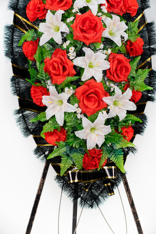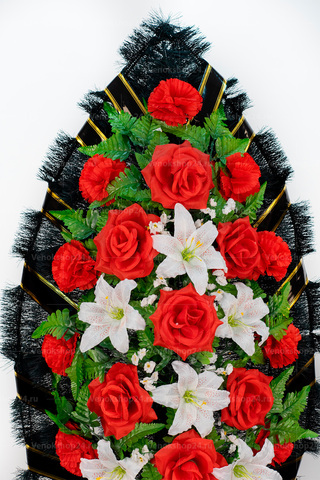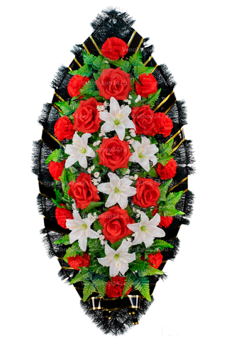 Оригинальный дизайн ритуального венка из искусственных цветов строится на сочетании белоснежных лилий, карминово-красных роз и алых гвоздик на фоне ярко-зеленой листвы. Дополняет композицию обрамление из еловых ветвей, перевитых красной лентой с золотой каймой. Белые лилии символизируют чистоту и непорочность, а красные цветы — святость и милосердие.