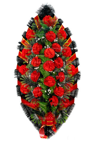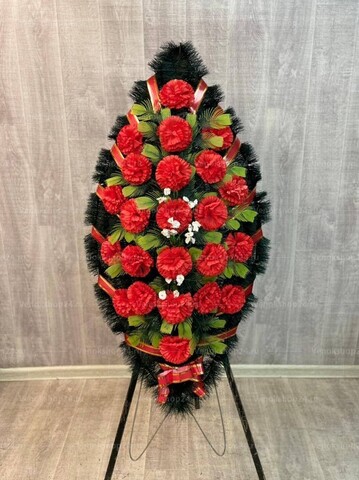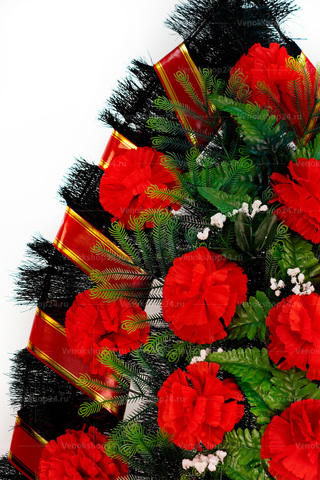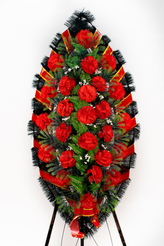 В центре композиции располагаются алые гвоздики на фоне яркой зелени. Еловая гирлянда, обвитая красной декоративной лентой, обрамляет композицию. Венок из искусственных цветов выразит траур и продемонстрирует уважение и любовь к усопшему.